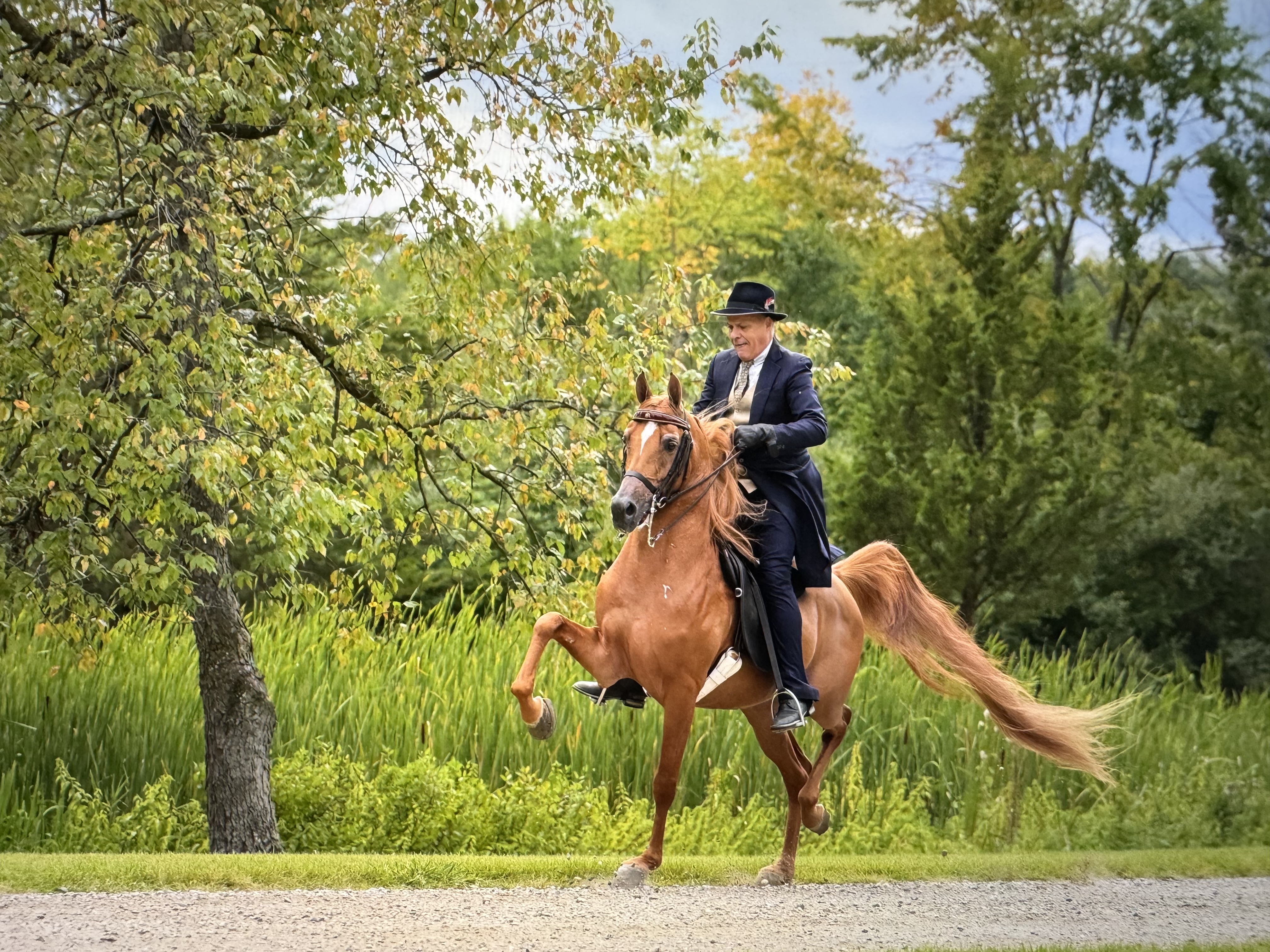 Profuzion is a beautiful, talented, young English Pleasure stallion. His pedigree is filled with National Champion English Pleasure and Park horses. Shown only once he was Top Ten in the 2023 US National English pleasure Futurity class. This young colts pedigree screams trot! Sired by the Multi National Champion Park and English Stallion, Prosuasion who is by SF Specs Shockwave and out of the lovely mare, GSF Ambienze, herself also a Multi National Champion Park and English horse. She is sired by Apollopalooza another Multi National Champion Park Horse and out of the great producing mare, PWA Tusea. We are looking forward to his career both in the show ring and the breeding shed.